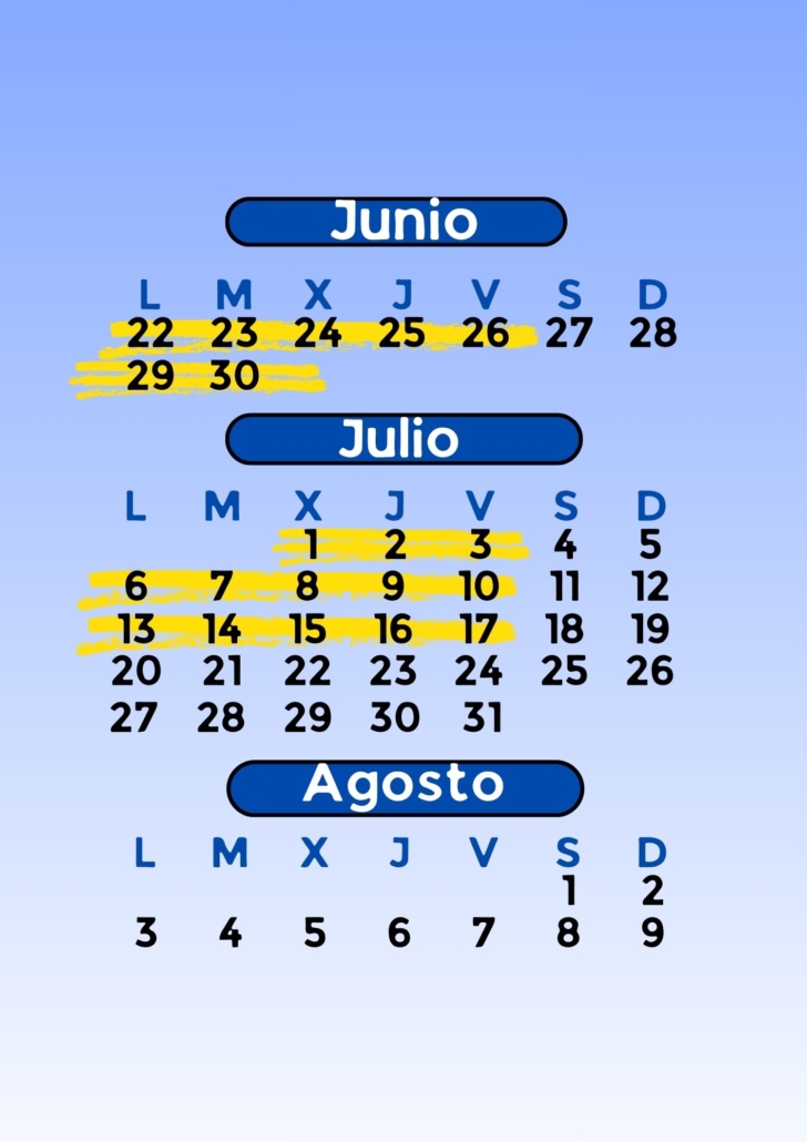 01 —7 semanas— ⬇️ Del 22 de junio al 7 de agosto (precio reserva)...09 —4 semanas— ⬇️ Del 6 al 31 de julio (precio reserva) ...