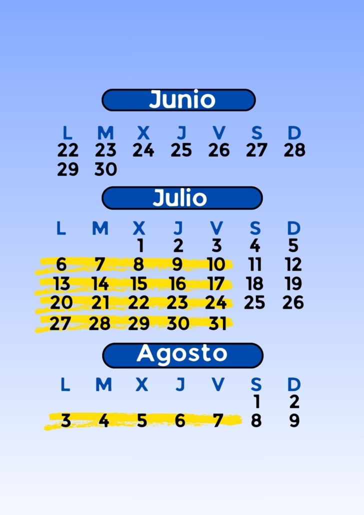 09 —4 semanas— ⬇️ Del 6 al 31 de julio (precio reserva) ...10 —4 semanas— ⬇️ Del 13 de julio al 7 de agosto (precio reserva)...
